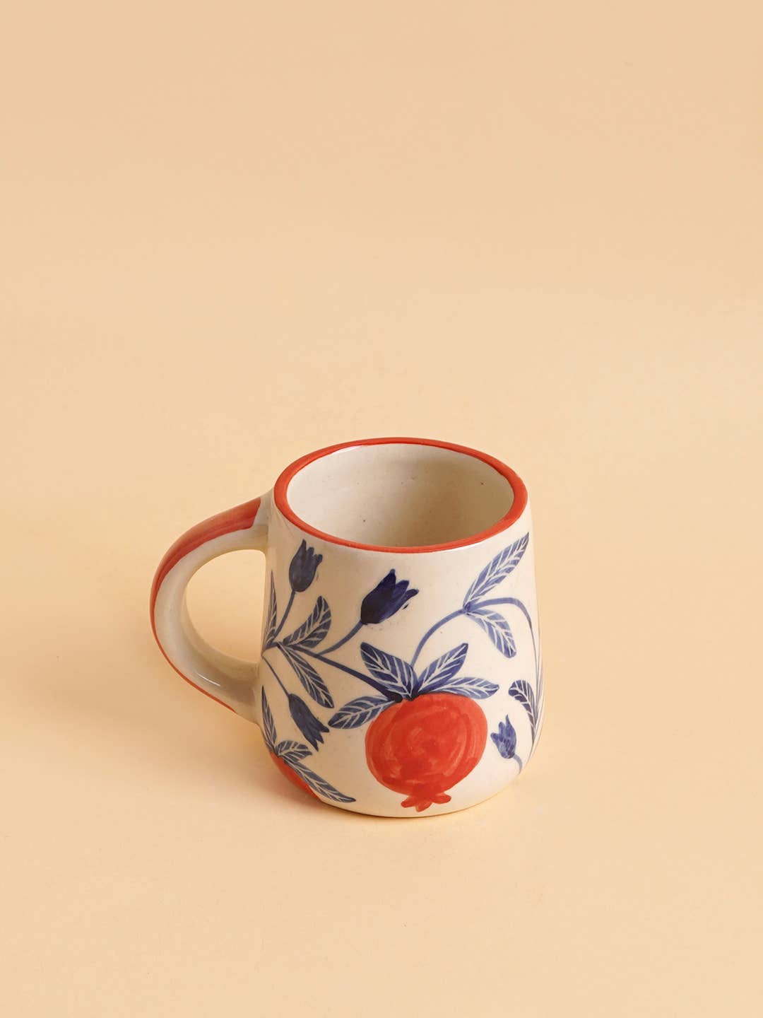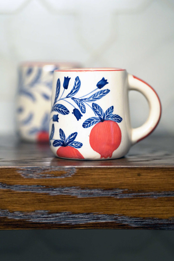A harmonious blend of cobalt blue and rich red florals hand-painted on creamy stoneware. This adorable mug showcases a traditional folk art design across its surface, while its sturdy handle brings comfort to your daily tea or coffee moments. The delicate floral motif appears to float between the two hands shown in the image, highlighting the mug's artisanal charm.