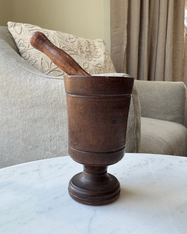 A beautifully aged piece of history, this turned wood mortar and pestle brings authentic character to your space. Each ridge and mark tells the story of its past life in a European apothecary. Whether displayed as a collected object or put to use in your modern kitchen, its rich patina and classic pedestal form add an elevated touch of time-worn charm.