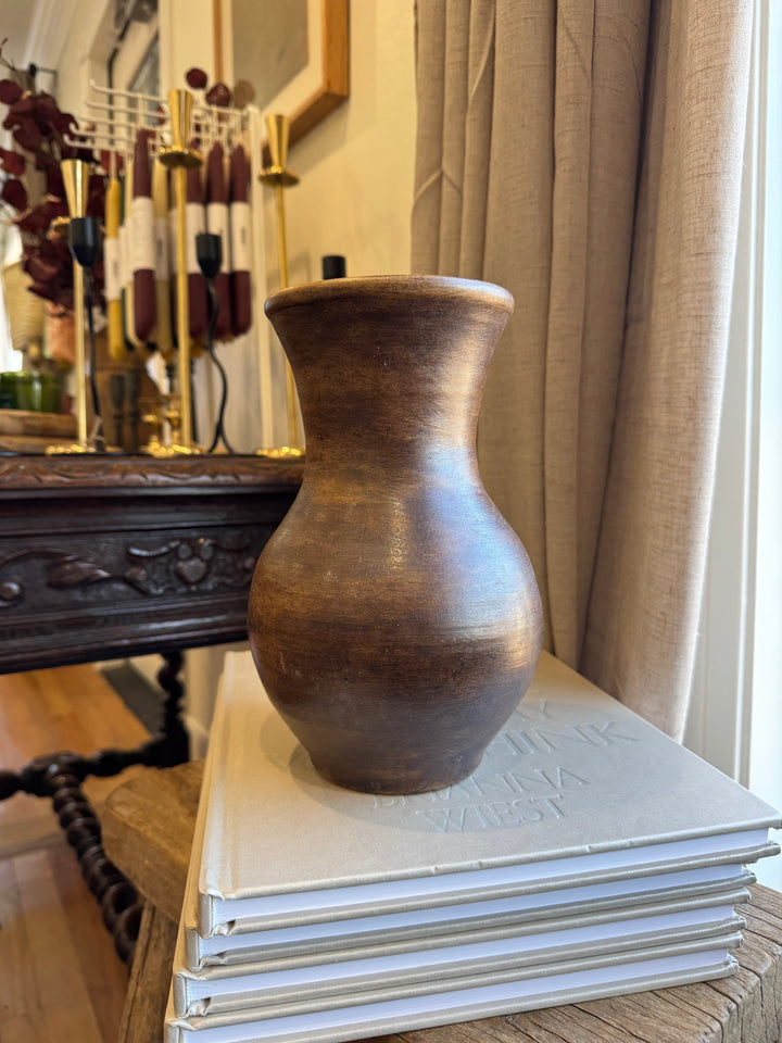 Classic pottery vase featuring a concave neck and bulbous body, hand-thrown in dark clay with a matte bronze finish. This traditional amphora-inspired shape dates to the mid-20th century, likely European craftsmanship. Height approximately 8 inches. Shows desirable patina and signs of authentic aging.