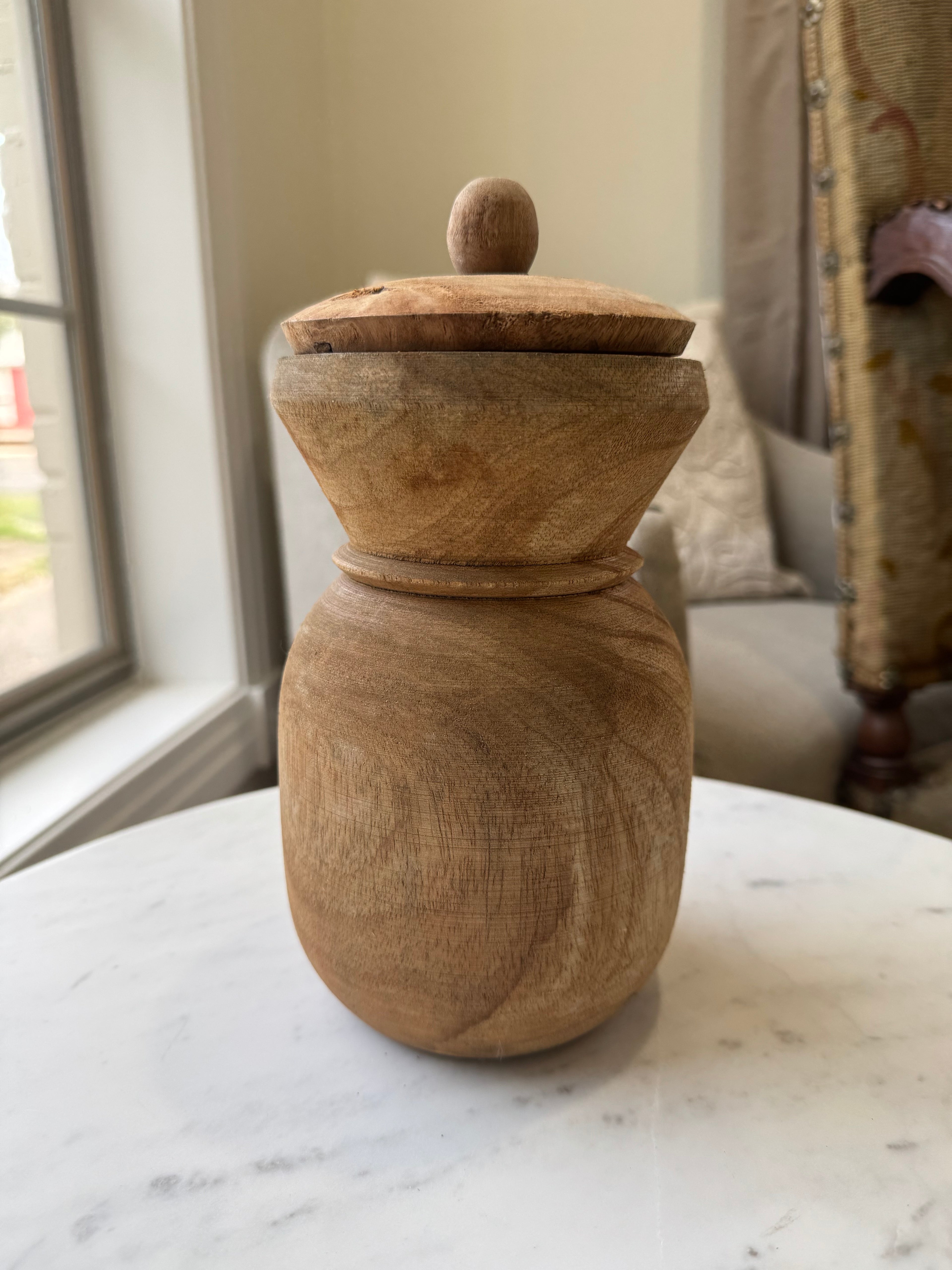 Meet our favorite kitchen companion – a beautifully crafted wooden vessel that brings warmth and character to your countertop. Hand-turned from natural wood with a raw, organic finish, this piece proves that practical can also be pretty.