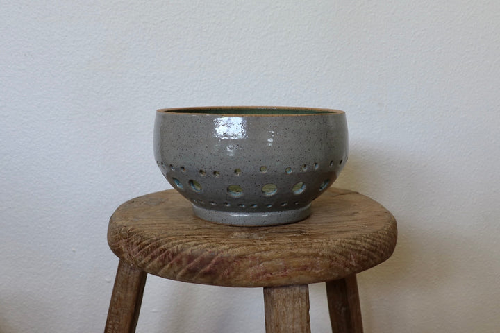Handcrafted by Austin ceramist Alexandra Bond, this functional art piece features a sage green glazed interior with an artfully arranged pattern of perforations, creating a mesmerizing play of light when in use. The natural unglazed rim adds organic contrast to the polished interior, while the speckled ceramic body showcases the artist's attention to detail. Perfect for rinsing berries and small produce, this bowl doubles as a striking decorative piece when not in use, casting enchanting light patterns on your counter or table.