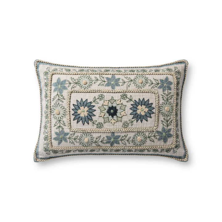 This 13"x21" down filled lumbar pillow features intricate machine embroidery with traditional botanical motifs in teal and sage green on a neutral background. The design showcases three ornate star-burst flowers surrounded by decorative vine borders, all framed with elegant rope trim piping. The solid dusty blue back complements the front's color palette. Down-filled for luxurious comfort, this pillow adds artisanal charm and support to any seating area.