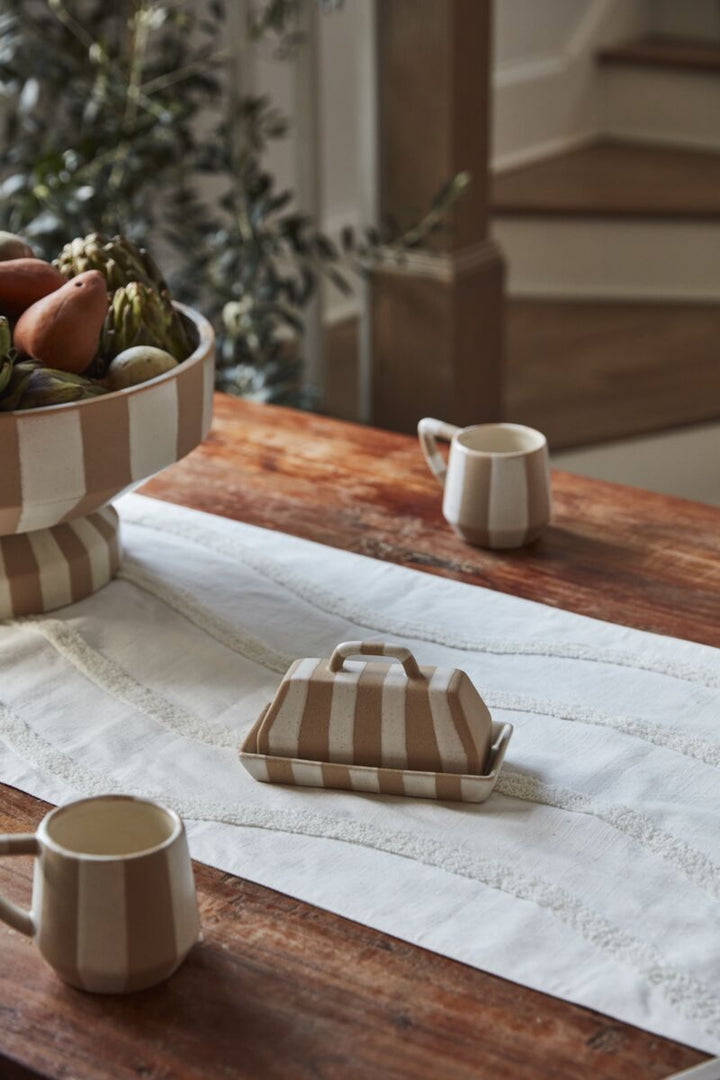 Elevate your dining table with the playful, artful design of the Botera Butter Dish. Featuring a food-safe finish on top of neutral, textured ceramic with chunky, speckled white glazed stripes. The stripes on the dish contrast with the stripes on the lid. We recommend handwashing to protect finish.