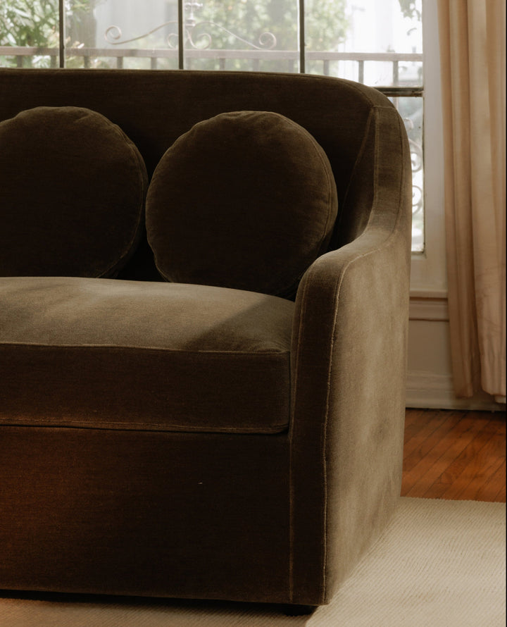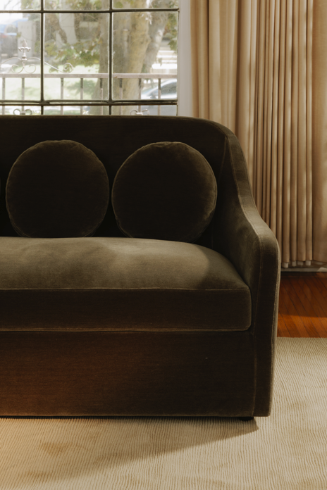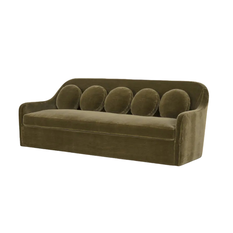 The Bria sofa straddles the traditional and the contemporary, with mid-century inspiration through five playful, pancake-shaped pillows. An embrace of everyday living proportioned for relaxation, this piece features inviting round forms and durable, forgiving mohair upholstery, balancing playful sophistication and enduring elegance.