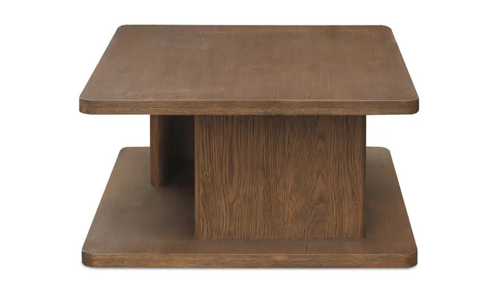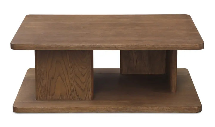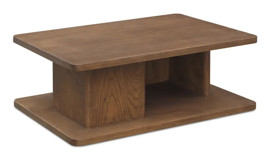 The Cory coffee table harmoniously blends rustic charm with contemporary aesthetics. A distinctive vertical support adorned with a refined bullnose edge adds sculptural grace to its minimalist design. Ample open storage beneath the tabletop offers practical display or storage solutions.