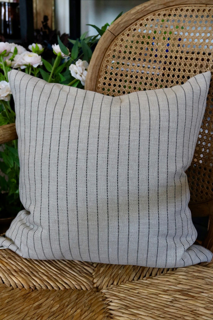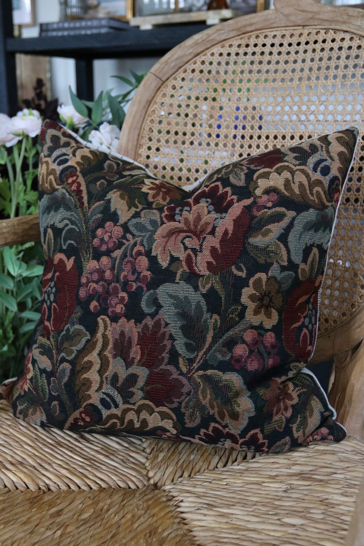 Luxurious reversible pillow featuring rich tapestry fabric with intricate floral motifs in deep jewel tones, paired with a classic cream pinstripe pattern on the reverse side.