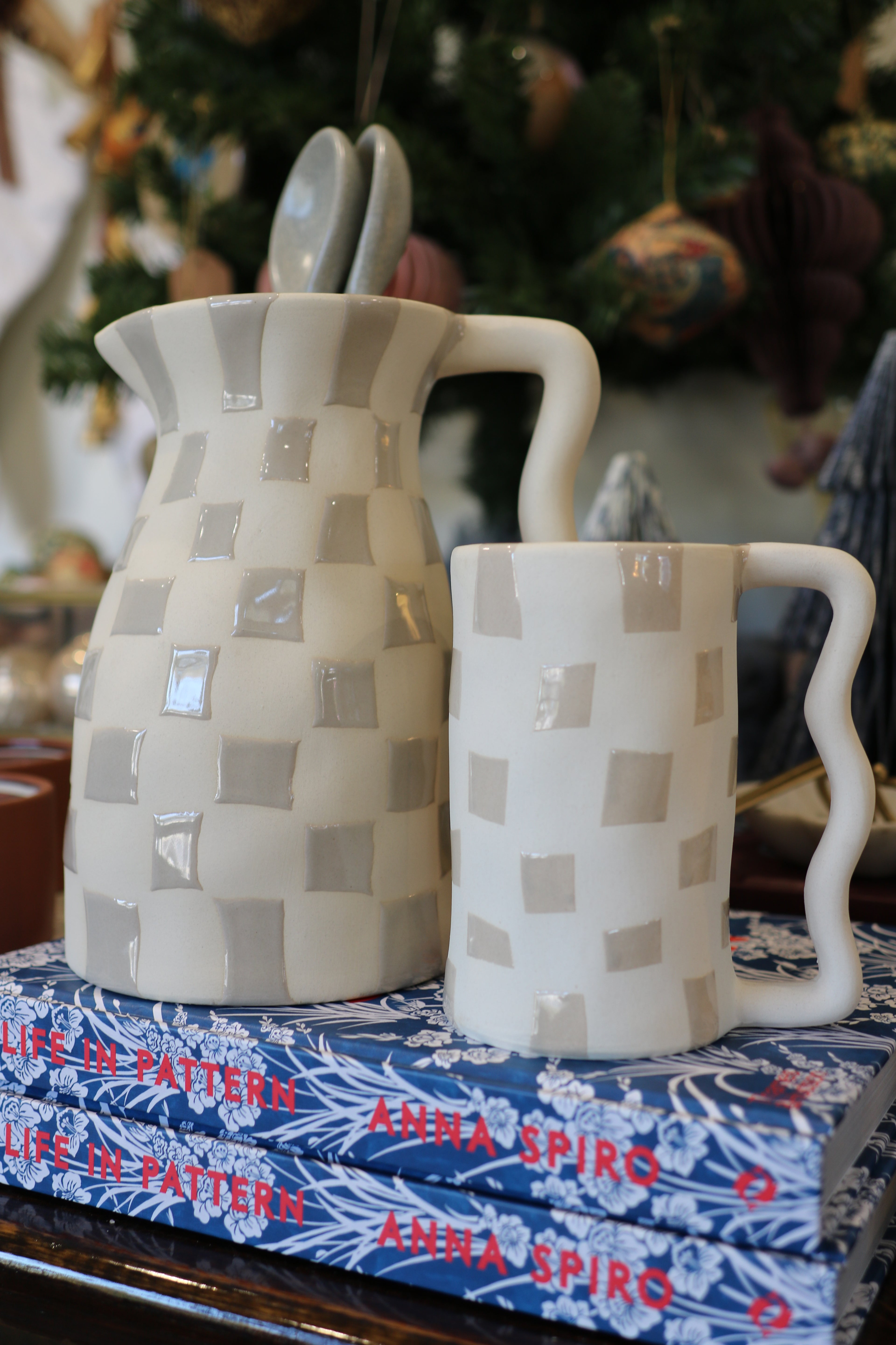 Elevate your morning coffee experience with the stylish Emil Mug. Crafted from food-safe ceramic, this trendy mug features an organic shape, unique squiggle handle, and a two-toned checkerboard pattern. The neutral colors add a minimalist touch to the eye-catching design. Handwashing is recommended for long-lasting use.