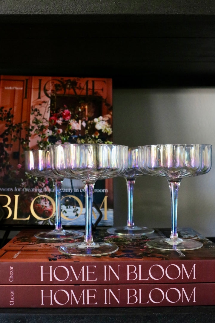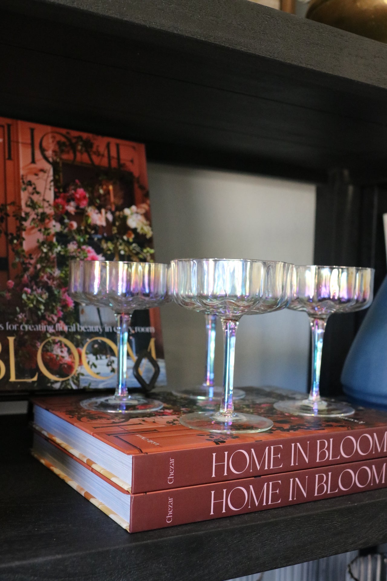 Transform your gatherings with this exquisite Pair of Flower Iridescent Cocktail Coupes. Designed to bring a touch of sophistication to your table, each glass showcases a stunning iridescent pattern that catches the light beautifully, making it the perfect complement to any brunch or dinner party.