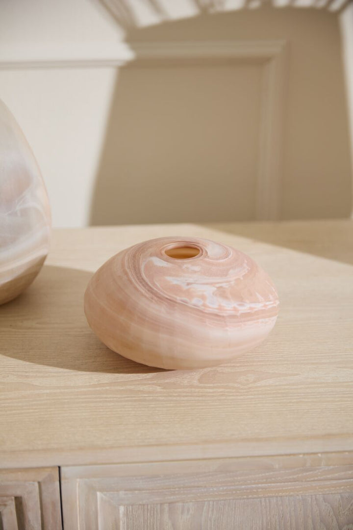 Like time-worn marbled stone, the mouth-blown, soda-lime glass Gasparo Budvase stands out with its pink hue & color variation. This handcrafted low, round vessel offers a beautiful matte finish created from a surface grinding technique so that each one is unique. Style this home accent with a few statement stems or as a sculptural, decorative art piece on shelves.