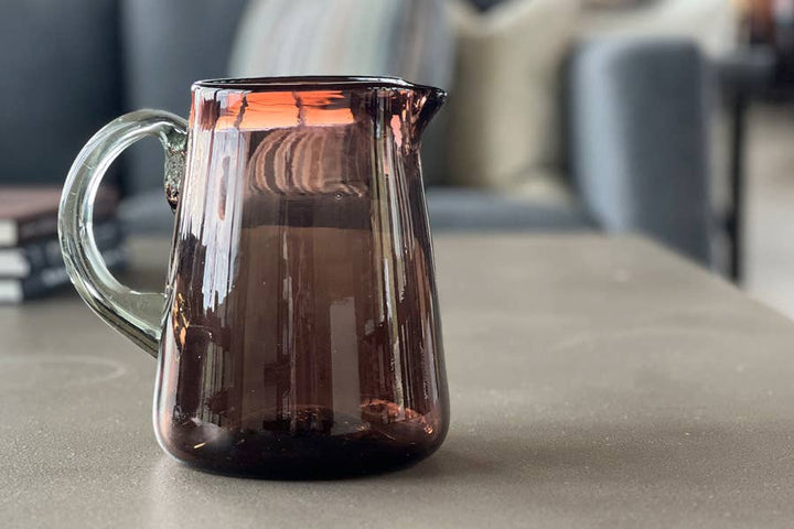 Discover our eco-friendly handblown recycled glass pitcher, expertly crafted by artisans in Jalisco, Mexico, from recycled glass bottles. Each piece is unique, showcasing the artistry of handmade craftsmanship.