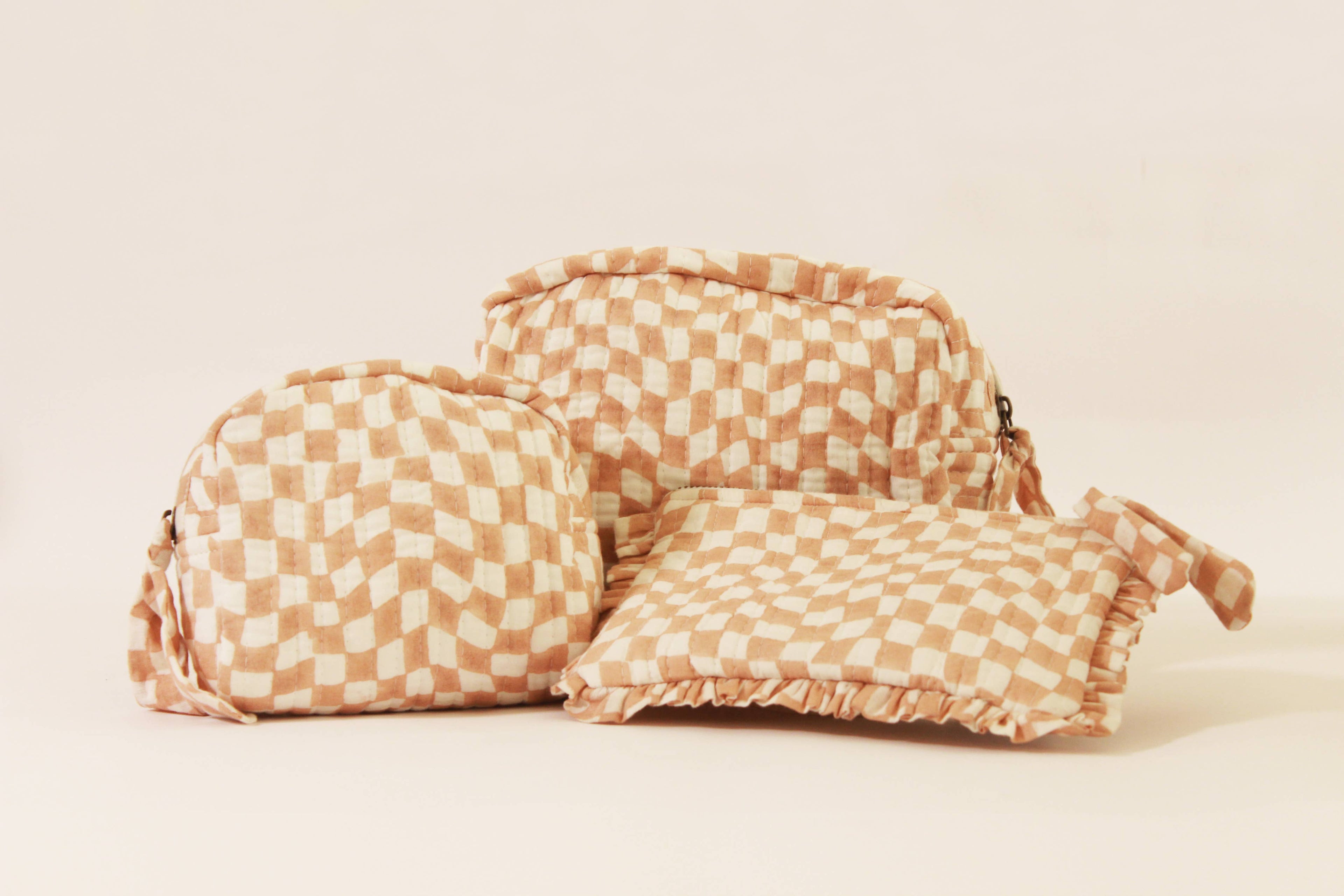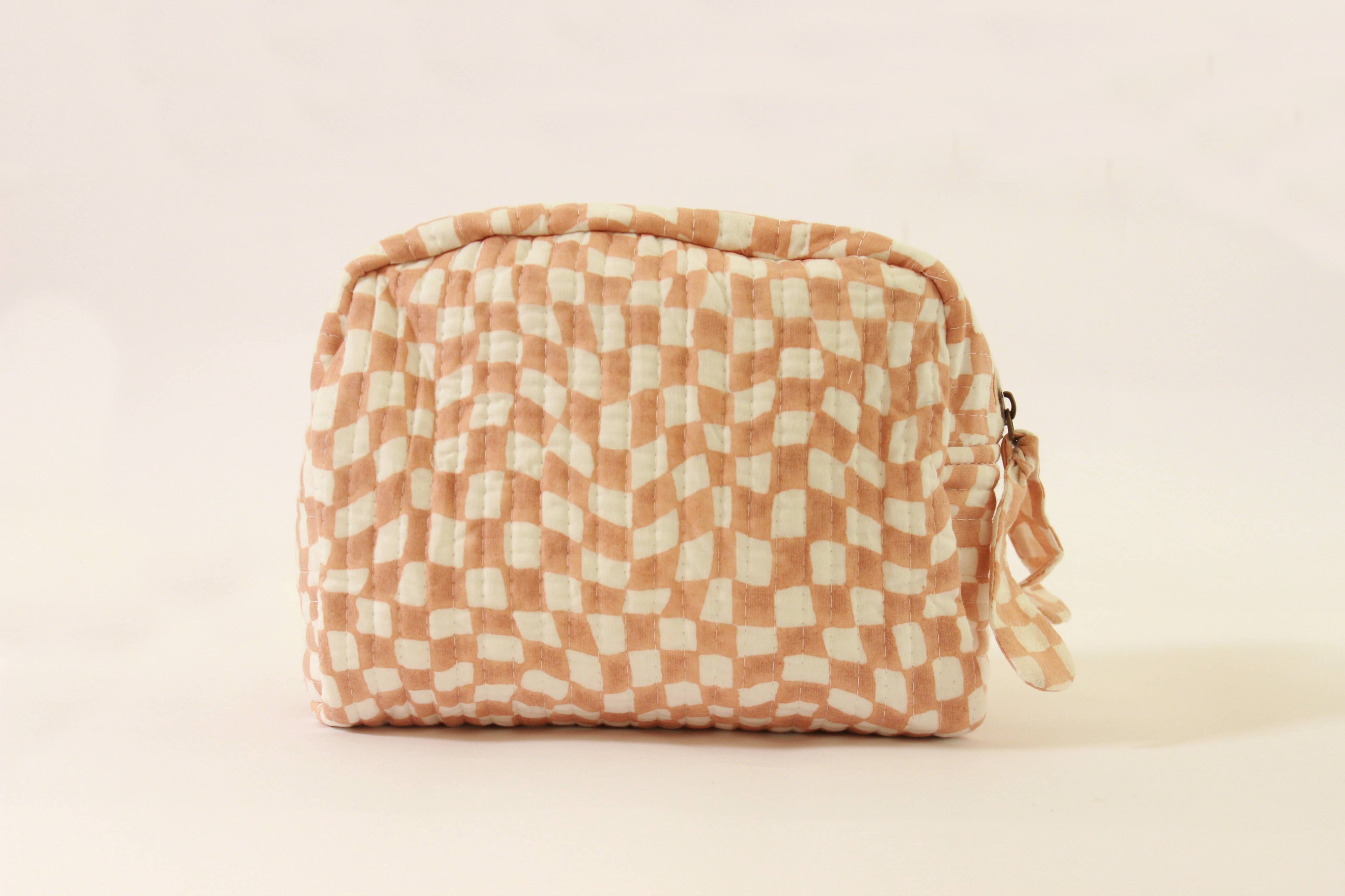 Introducing our Travel Pouch, designed for the discerning traveler seeking both style and functionality. Each piece is meticulously crafted from quilted cotton, featuring a charming mid-modern print in peach and white. Say goodbye to travel clutter as these pouches keep your essentials neatly organized, whether it's toiletries, tech accessories, or travel documents. Stay organized and travel with flair wherever you go!