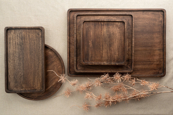 The Heritage Rectangular Tray, crafted from sustainable mango wood with a rich dark stain, offers a moody and sophisticated look. This showstopper is versatile, enhancing coffee tables, kitchen islands, or dining tables combining elegance and utility.