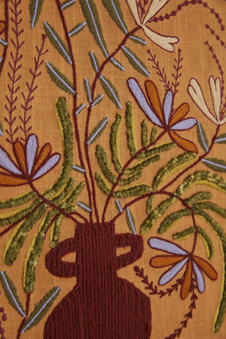 Artist Jessica Hiemstra livens up interior design with her folk art-inspired creations & mix of color & pattern. The rectangular, embroidered Andalusia Wall Art is full of personality with its unique vase & floral design in a variety of stitched techniques on a cotton cotton background. With a seasoned mango wood frame & sawtooth back hanger, this decorative piece adds a rustic, artisanal touch to the wall.