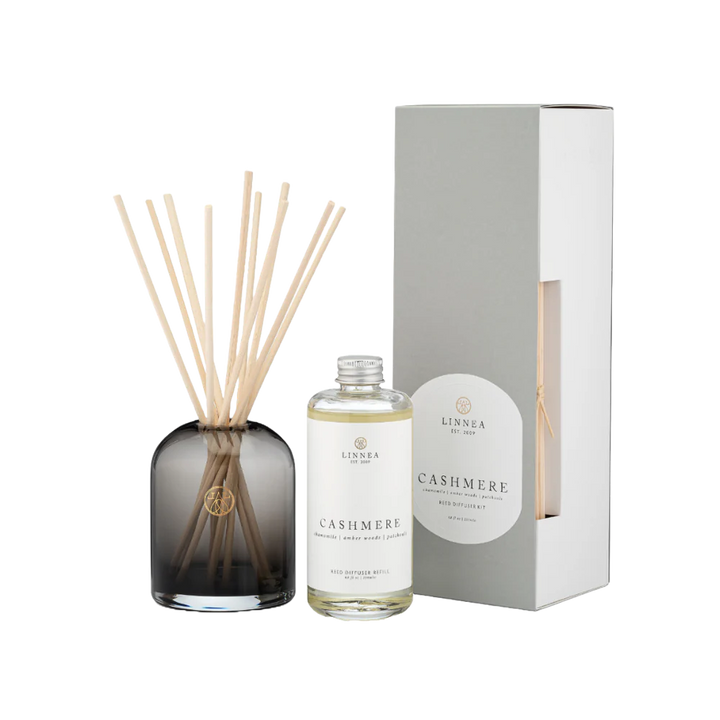 A sophisticated blend of warmth and elegance, this diffuser envelops your space in soft, comforting notes. Ideal for low-maintenance ambiance, natural rattan reeds gently disperse the scent, infusing your home with lasting fragrance. The kit includes a mouth-blown refillable smoke gray glass vessel, a premium scent blend refill, and rattan reeds for consistent diffusion with a simple flip.