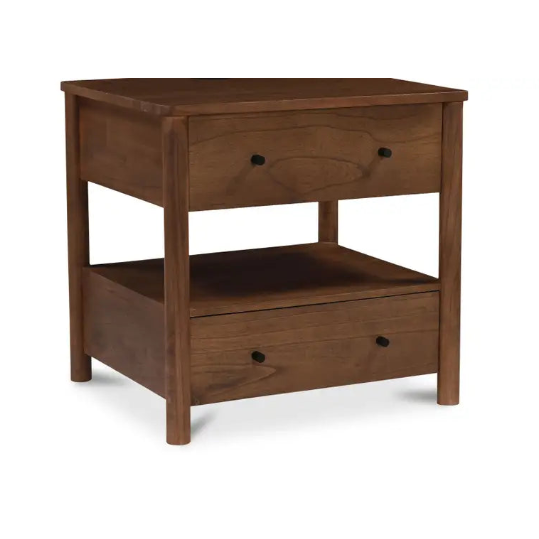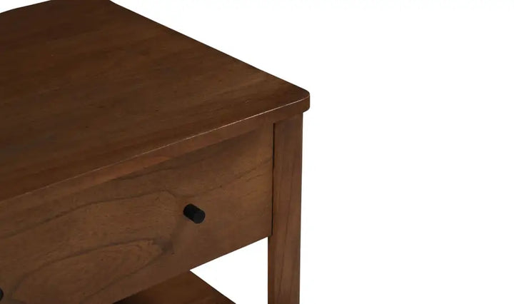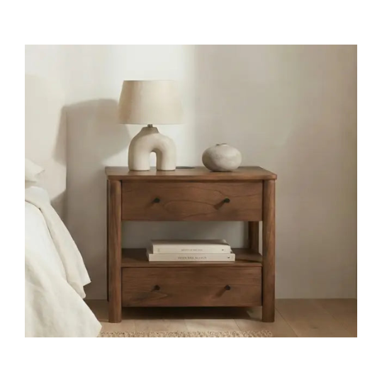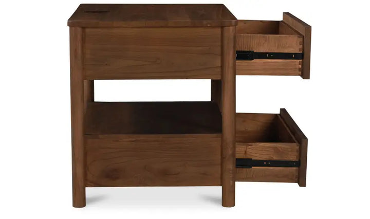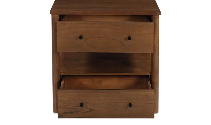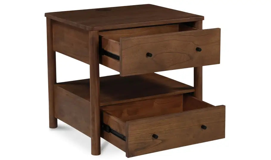 An integrated wireless charging capability for Mac and Android devices seamlessly merges classic design with modern convenience, elevating bedside organization with contemporary innovation. Meticulously crafted from new neem wood with mango veneer accents, the Lottie charging nightstand features two drawers and a central open space for versatile storage. The traditional silhouette is enhanced by sleek black handles, creating a timeless appeal.