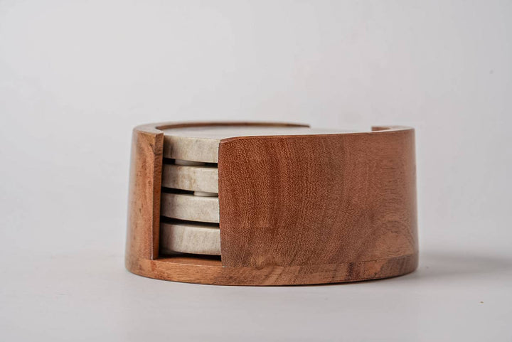 Protect your surfaces in style with these handcrafted marble coasters. Each 4" coaster features unique natural veining and comes with a sleek wooden storage holder. The durable marble design prevents water rings and heat damage while adding timeless elegance to any space