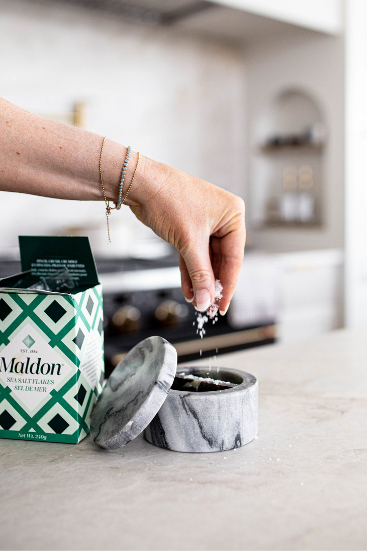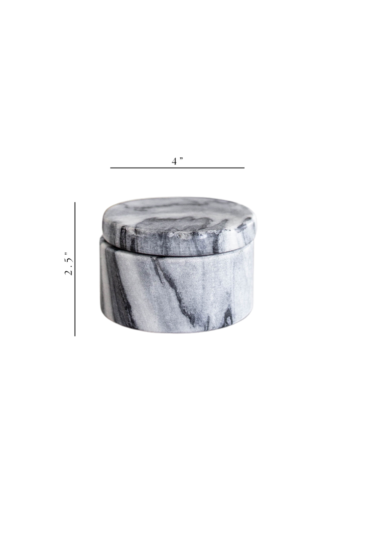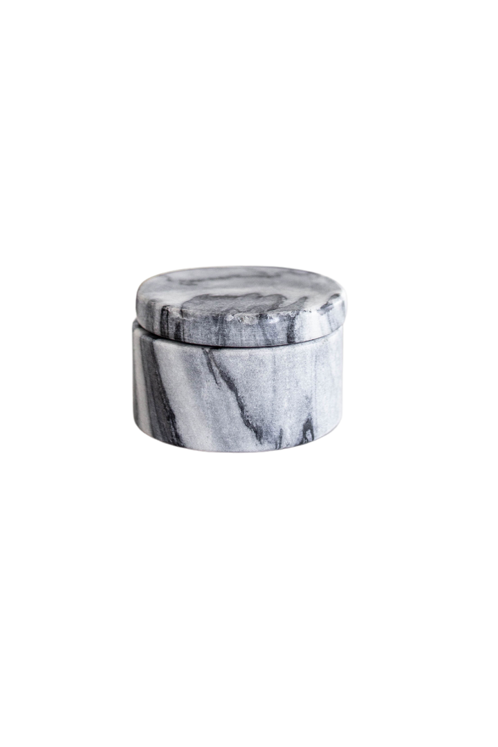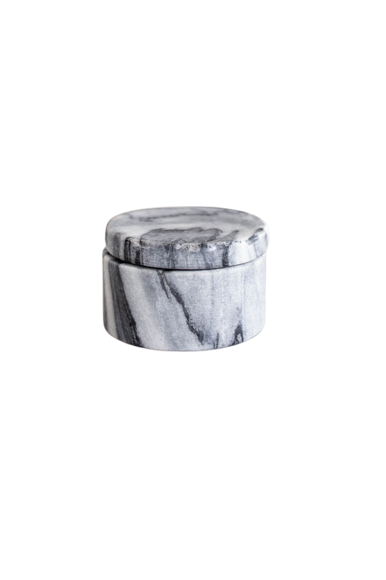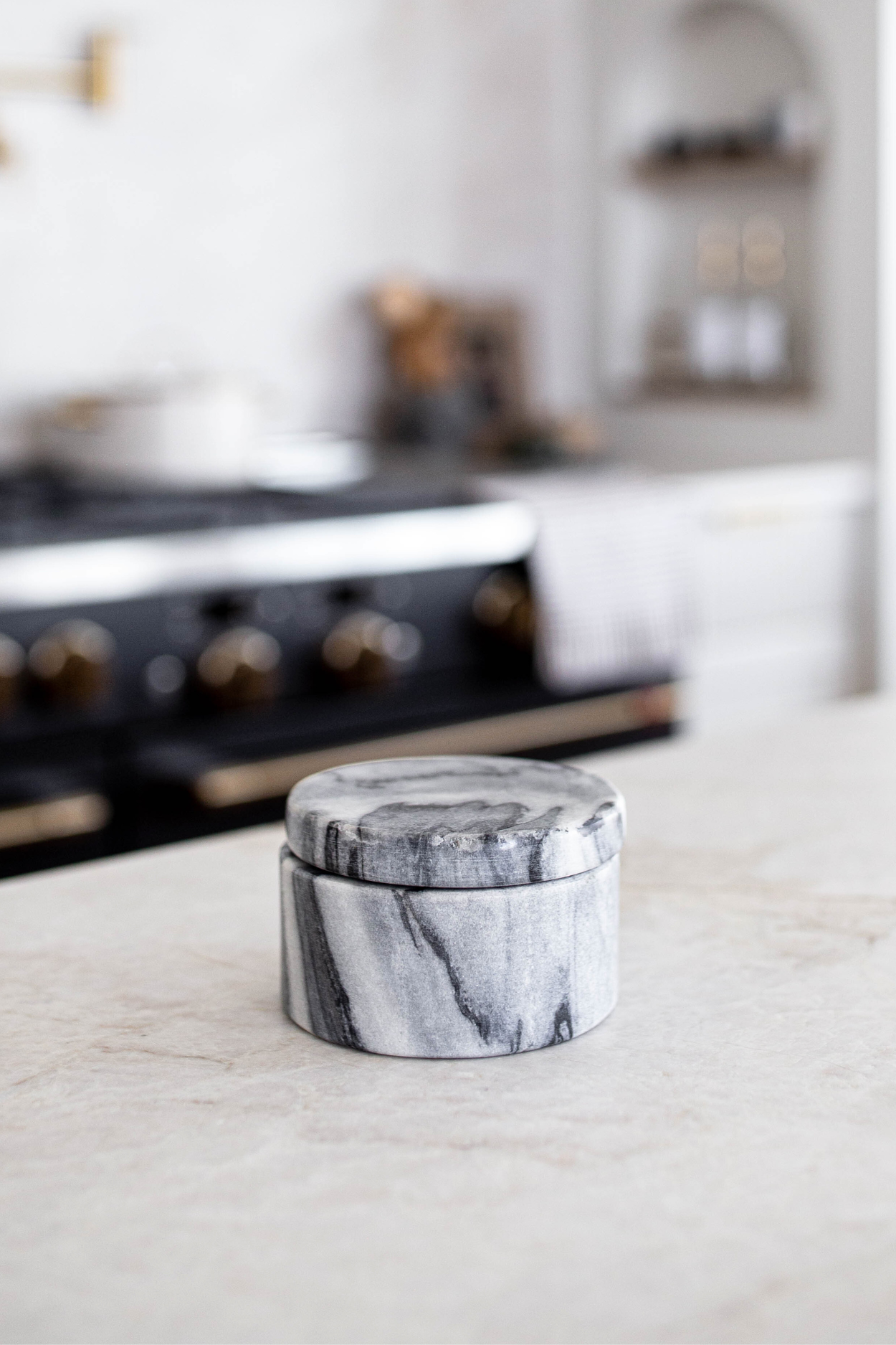 Expertly crafted to display your gourmet salts and peppers, our Marble Salt and Pepper Canister is a must-have for any kitchen. Dimensions: 4" Diameter x 2.5" Height approx Variations in colour, and texture may occur.
