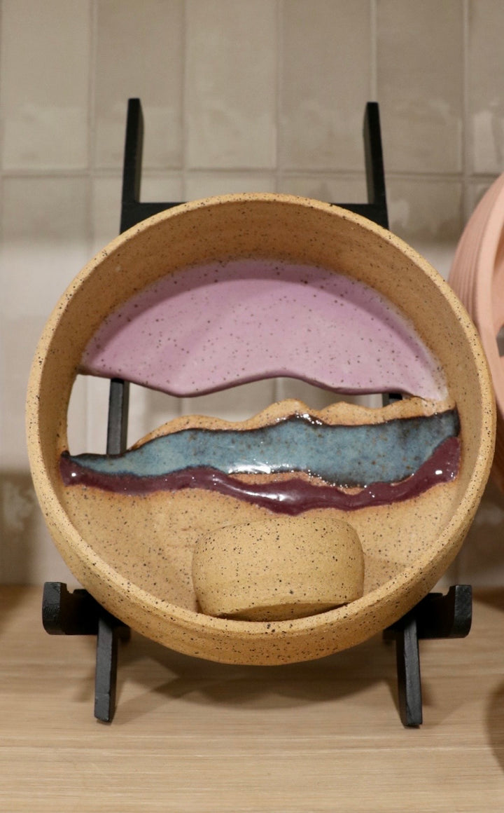This artisanal ceramic wall sconce, handcrafted by Austin ceramist Alexandra Bond, captures the serenity of a mountain landscape at dusk. The piece features a textured sandy ceramic frame with an integrated tea light holder, adorned with a sweeping landscape design in layers of misty pink, deep purple, and stormy blue glazes. Each sconce is individually sculpted, creating a unique interplay of light and shadow when illuminated. The speckled, earthy finish complements the ethereal landscape, making it both a functional light source and a distinctive piece of wall art.