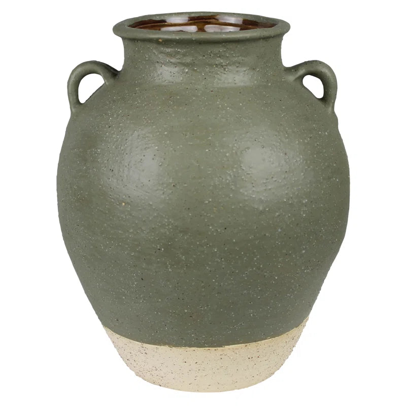 A beautiful blend of form and function, this substantial ceramic vessel features a classic Mediterranean silhouette with dual handles and a matte olive green finish. The textured, speckled surface contrasts elegantly with the natural clay base, creating a striking decorative piece. Perfect as a statement accent or functional storage, this urn brings timeless character to any space. The rustic yet refined design makes it versatile enough to complement both traditional and contemporary interiors.
