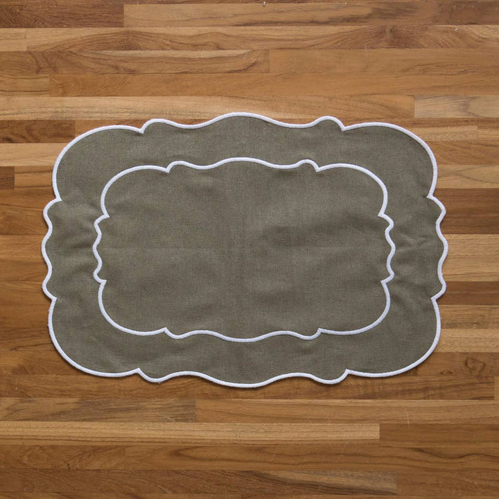 Olive colored linen placemat with white embroidery, treated to be resistant to stains and very easy to clean. An elegant way to dress your table.