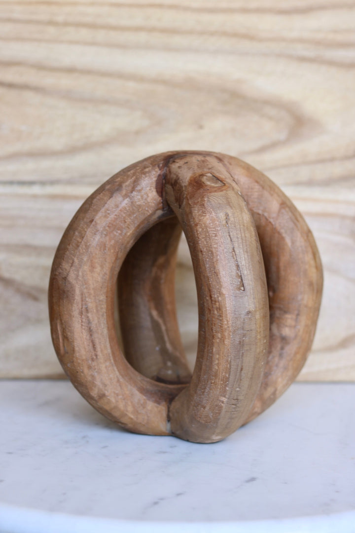 Ranked among the world's toughest hardwoods, Sal Wood is commonly grown in India and Nepal. When first cut, it is a light-hued grain but gradually turns darker with sun exposure. The Orbits Sculpture is a hollow sphere-shaped crafted from this long-lasting wood. It is designed to look as if two circles are intersecting.