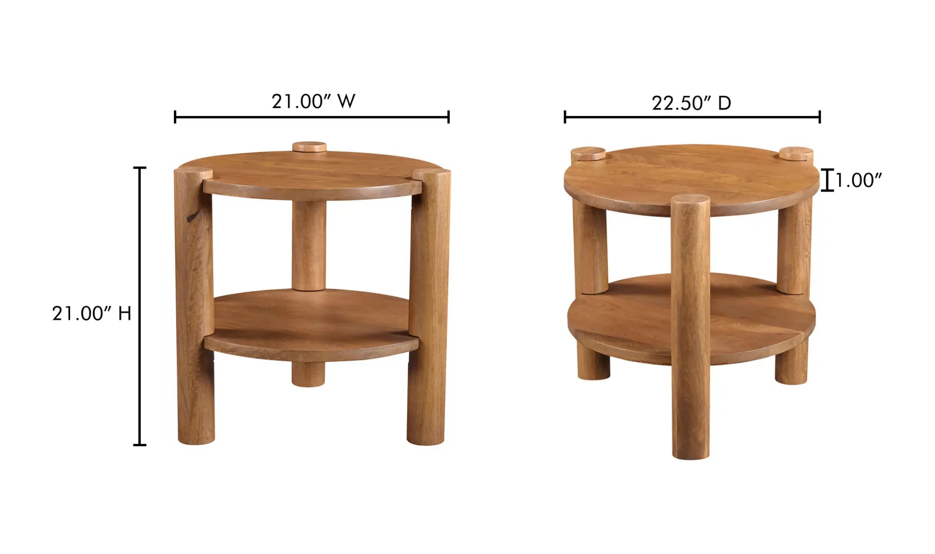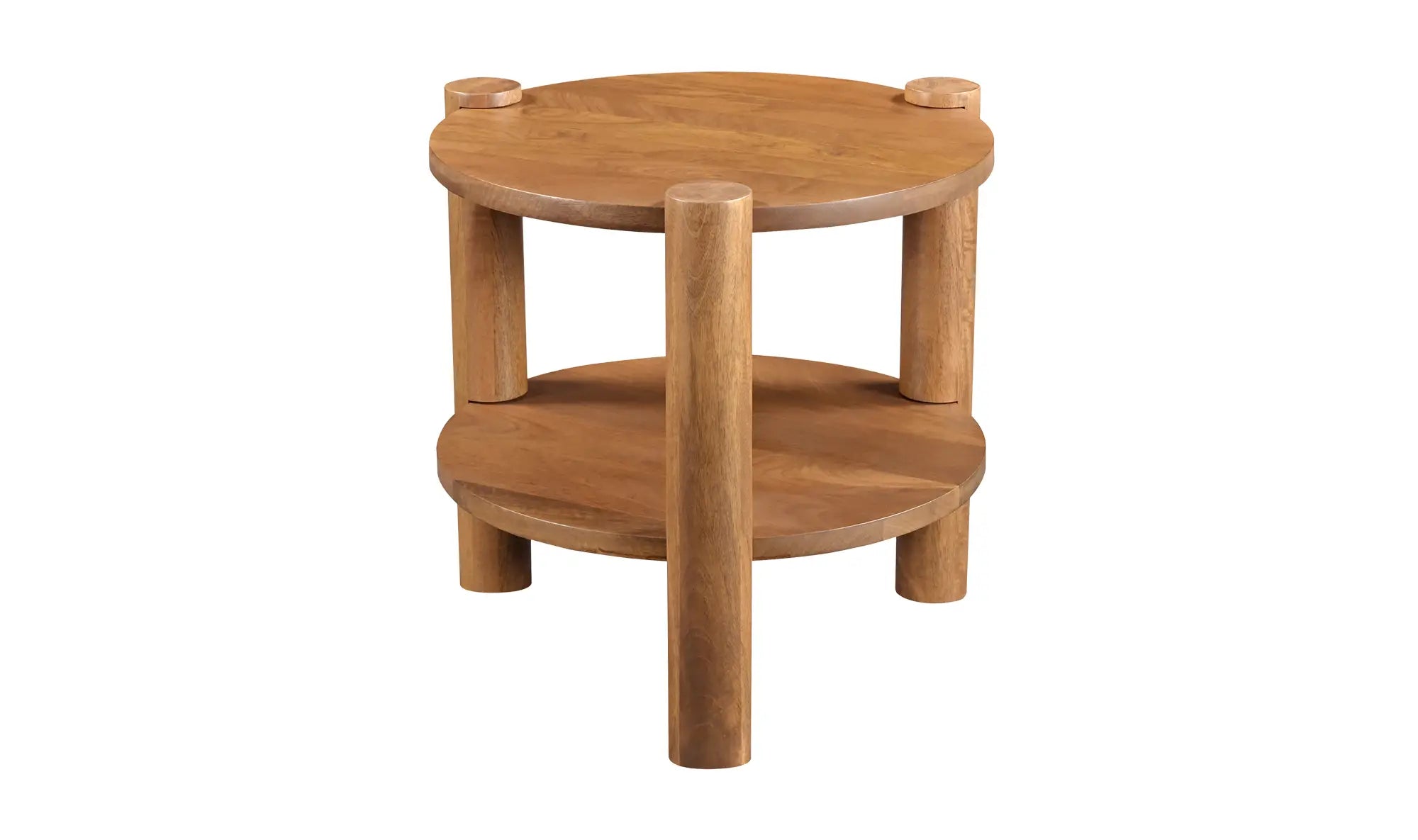 The Oscar accent table brings a vintage appeal and timeless charm, as its solid mango wood construction and warm brown finish add a rustic elegance. The cylindrical legs and meticulous joinery details are artfully incorporated alongside open storage. This piece effortlessly brings a sense of airiness and refreshing lightness to any space.