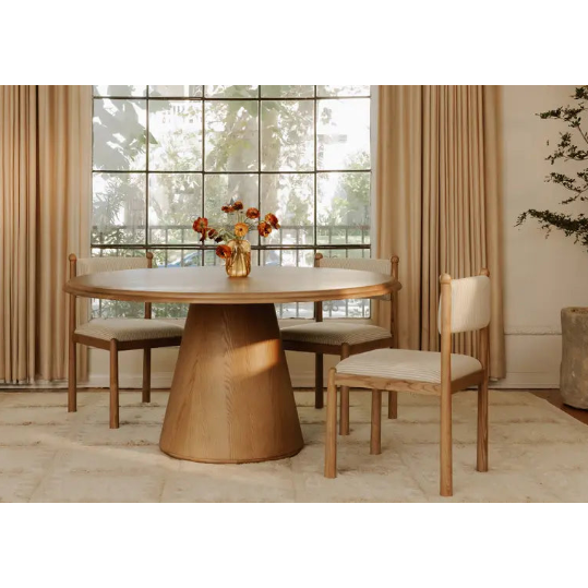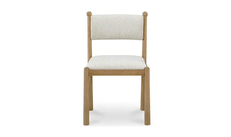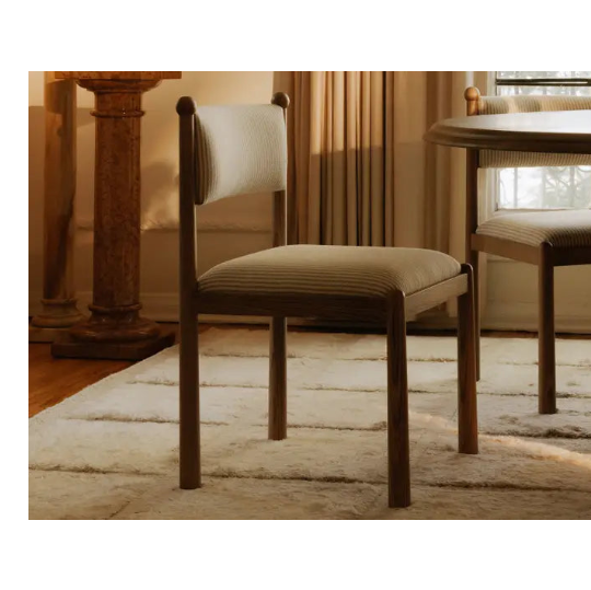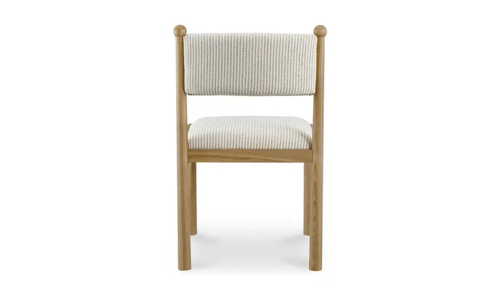 Gillian Segal for Moe's The Paisley dining chair echoes timeless allure. Showcasing classic stripes, each curve tells a story of heritage and finesse. Its warm, stained frame and whimsical finial touches draw inspiration from the vintage elegance of the '60s and '70s.