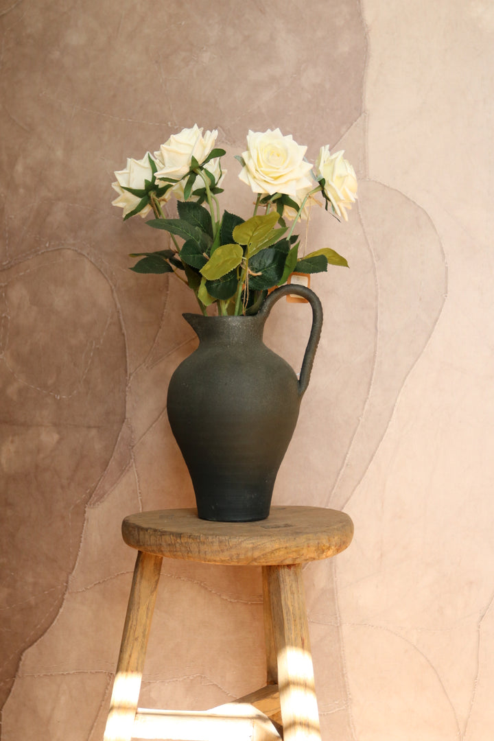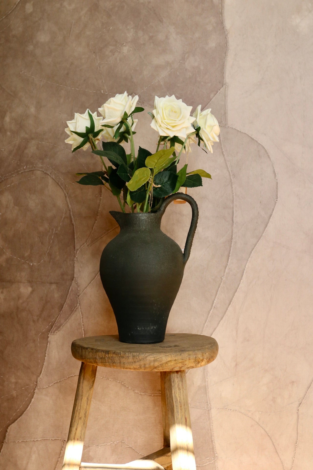 Dramatic curves & a statement handle draw deserved attention to the popular Ravine Jug. This small handmade terracotta pitcher evokes a sense of ancient beauty & modern simplicity with its timeless shape & aged matte black finish with variation in tone. Perfect for shelf styling or kitchen decor (not food safe), this vessel can be both functional vase filled with bright florals or a simple yet elevated decorative vessel.