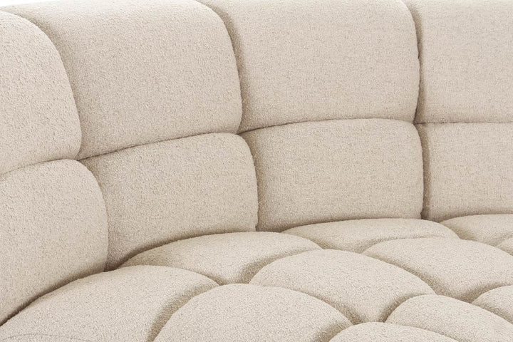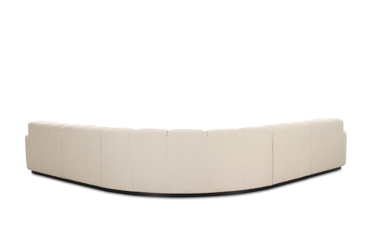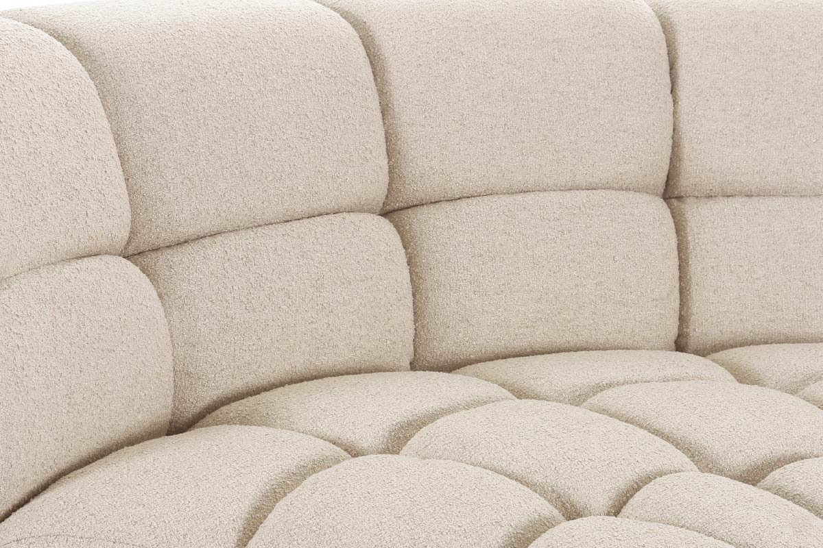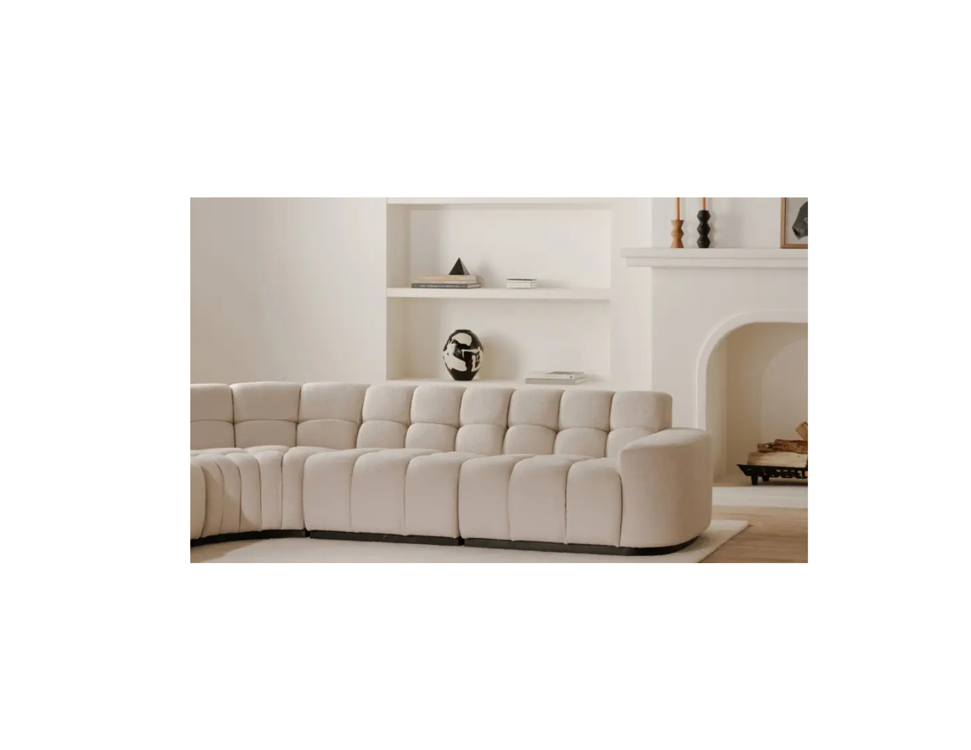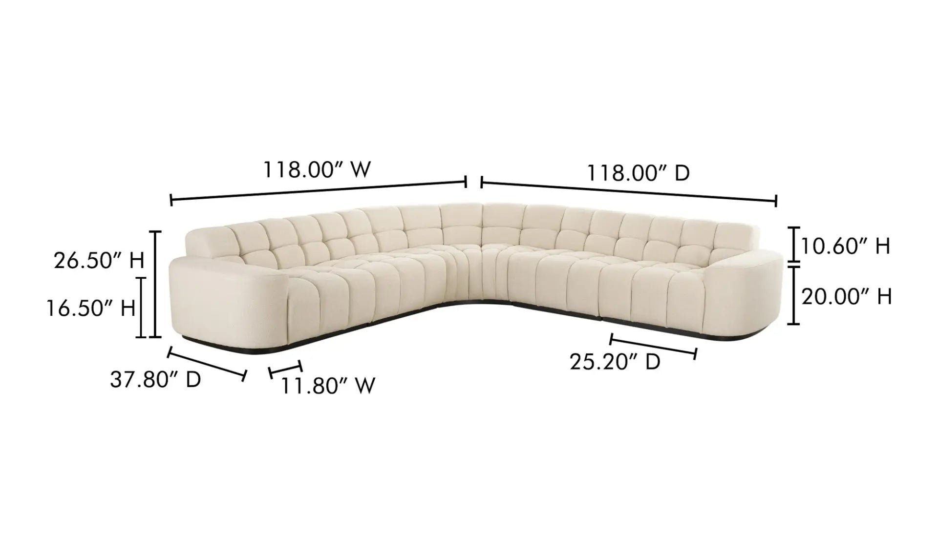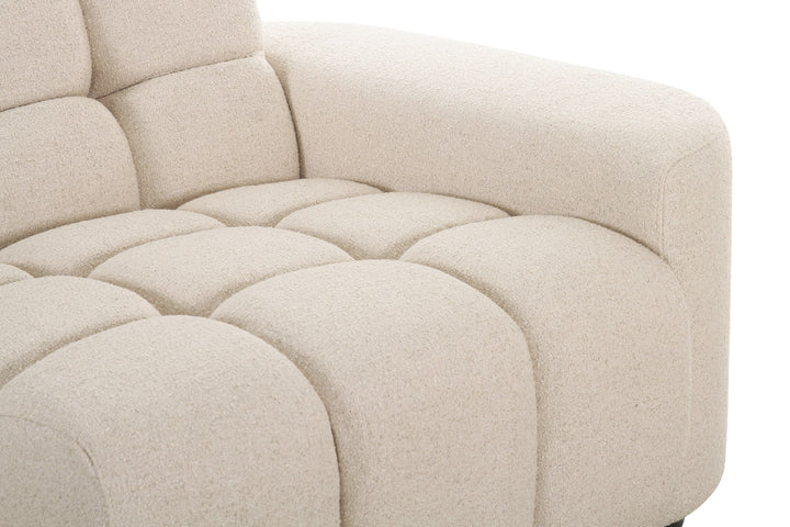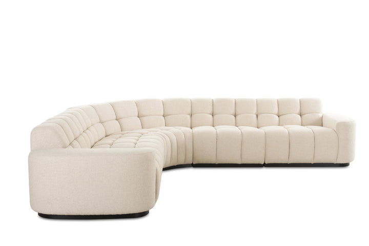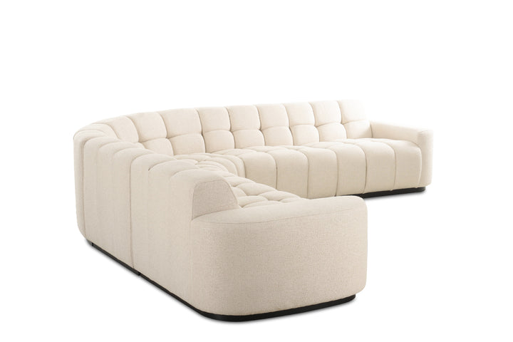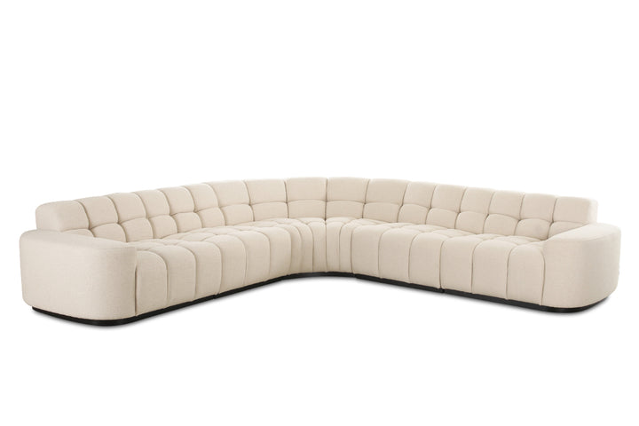 The Rhodes L-shaped sectional is all about versatility, meticulously designed in five pieces. This piece nods to vintage and modernist aesthetics, featuring classic square tufting that brings depth and texture to any living space. The wide, curved arm profile introduces an element of softness, elegantly contrasting with the geometric/grid-like detailing. Topped with plush seating, it promises unparalleled comfort and style.