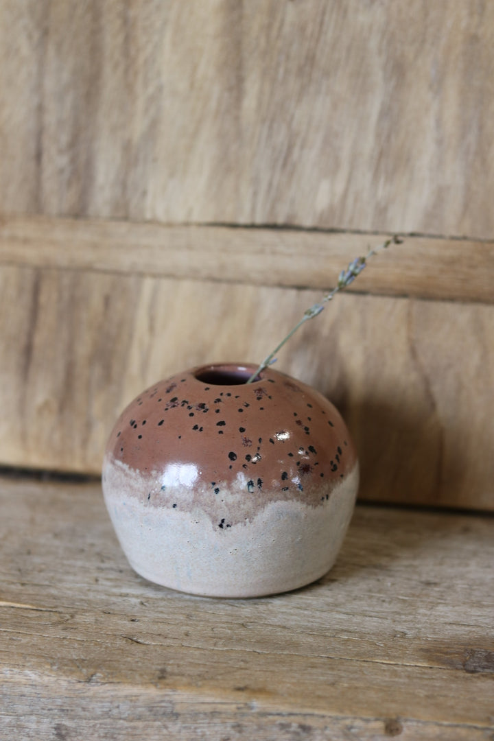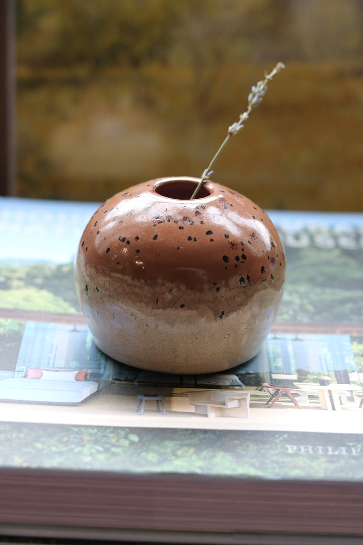 Handcrafted ceramic bud vase by Austin ceramicist Ali Bond, featuring a rich earth-toned glaze that transitions from warm terracotta to soft cream. The organic speckled pattern and smooth rounded form create a perfect vessel for single stems or dried botanicals. Each piece showcases the natural beauty of handmade pottery with its unique glaze variations and artisanal character.