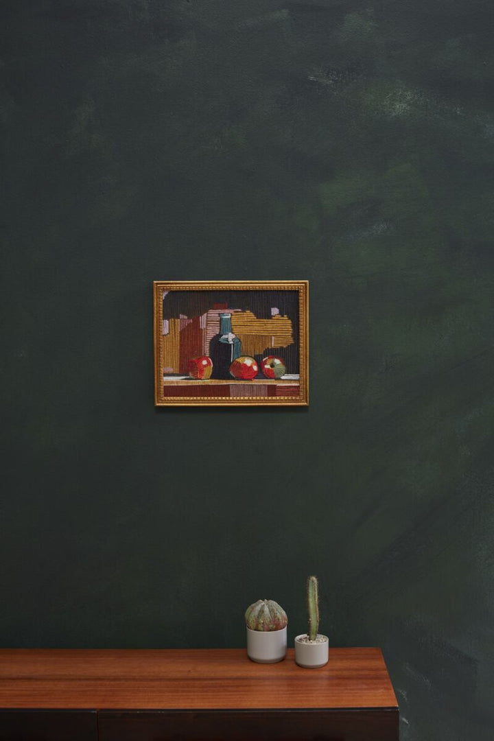 Bring the finer things in life to your walls with the artistry of this small still life textile, featuring an embroidered wine bottle & fruit with abstract color blending, beautiful highlights & unique texture surrounded by an elegant wooden frame.