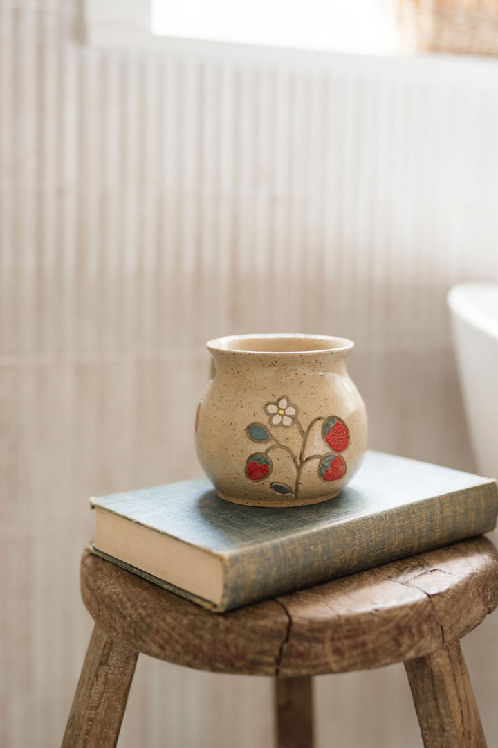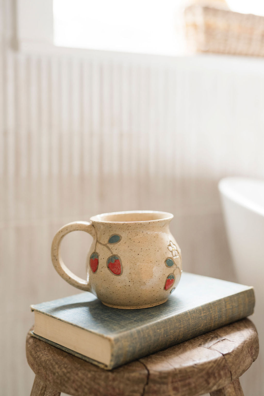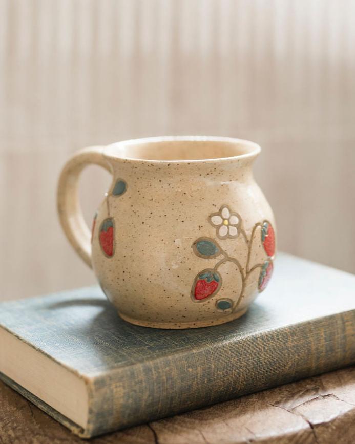 Sweet summer memories bloom across this artisanal mug, featuring hand-carved strawberries in cheerful coral red with sage green leaves. Each berry is lovingly detailed against the natural speckled ceramic, while a delicate daisy adds an extra touch of charm. Perfect for your morning coffee or as a collected piece that brings joy to your everyday rituals.