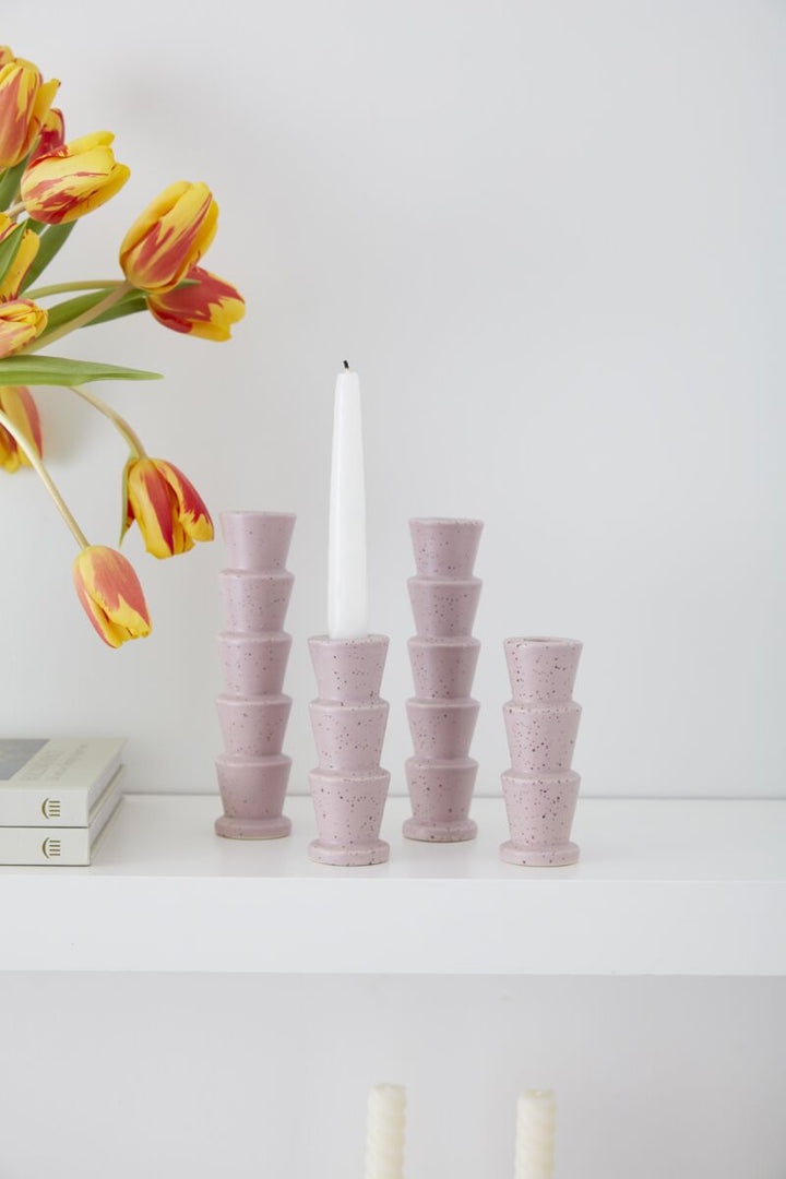 Bring modern, playful style & trendy color to event centerpieces or home decor with the tall, light-purple ceramic Taper Candleholder. It holds a standard size taper candle & fits under a 2.5-inch glass sleeve. Featuring stacked ceramic shapes, a smooth, speckled & a sturdy, circular base.
