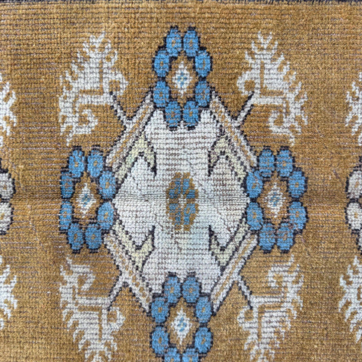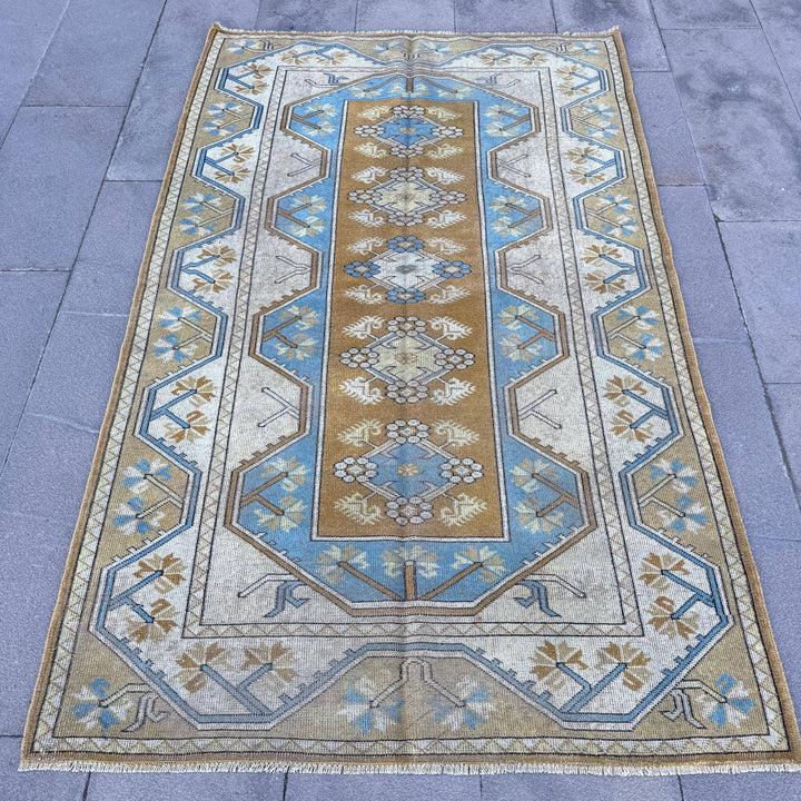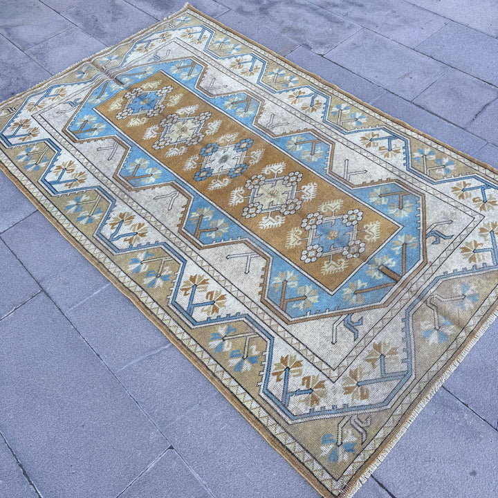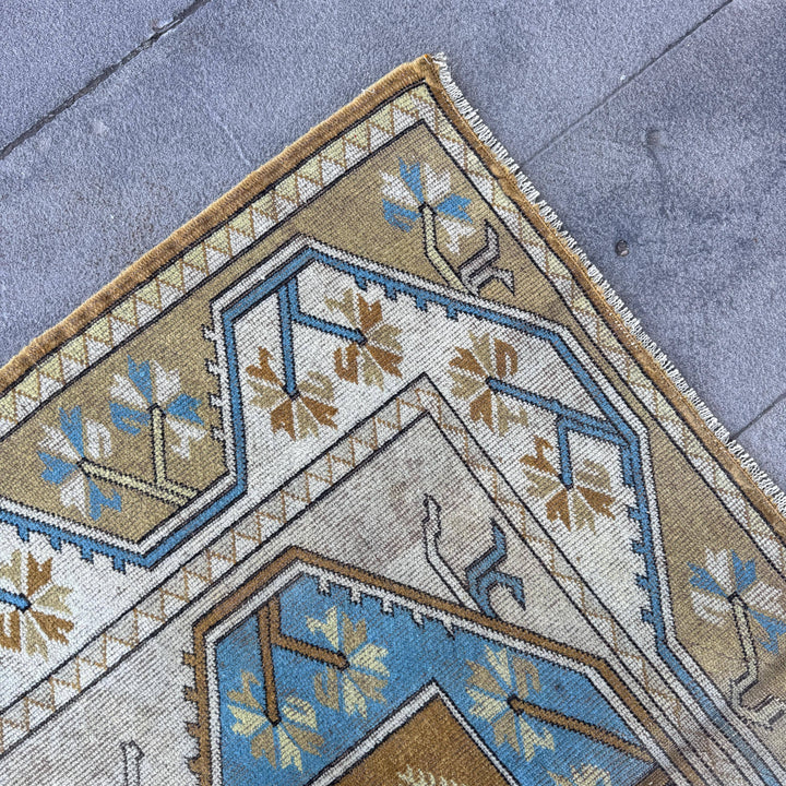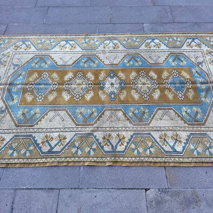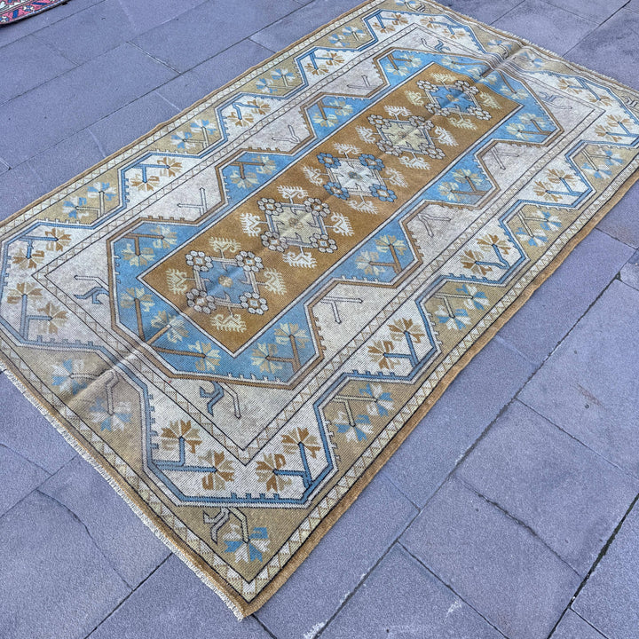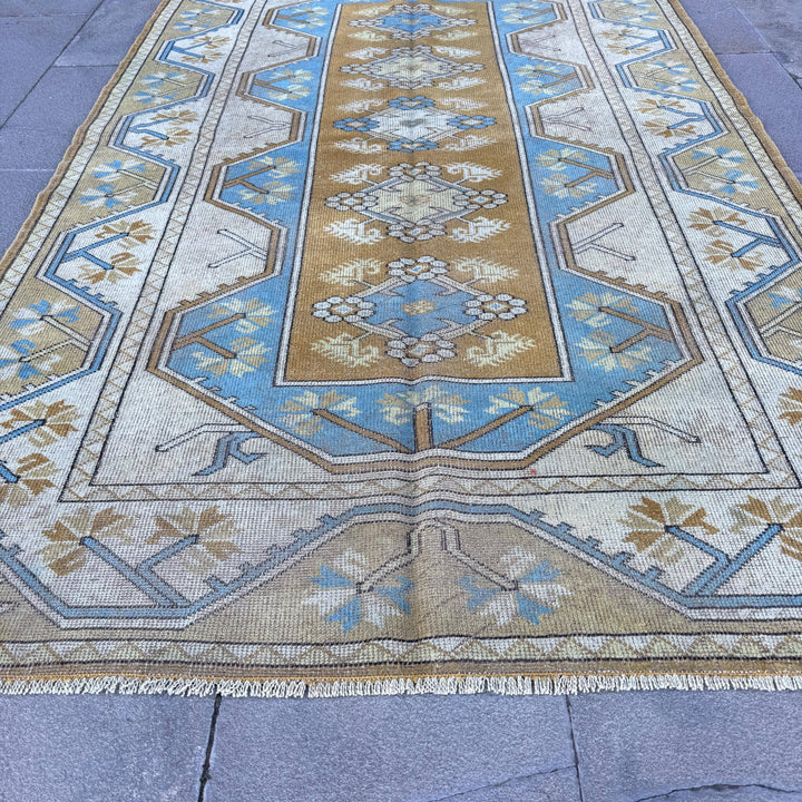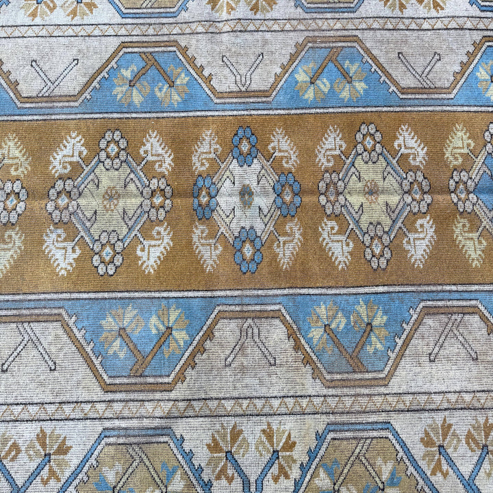 This striking Anatolian rug features a sophisticated geometric design with alternating hexagonal medallions in soft blue and warm taupe tones. The central column of diamond motifs is beautifully framed by intricate border patterns, showcasing the masterful artistry of Turkish weavers. The naturally weathered patina adds authentic vintage character that enhances any interior style.
