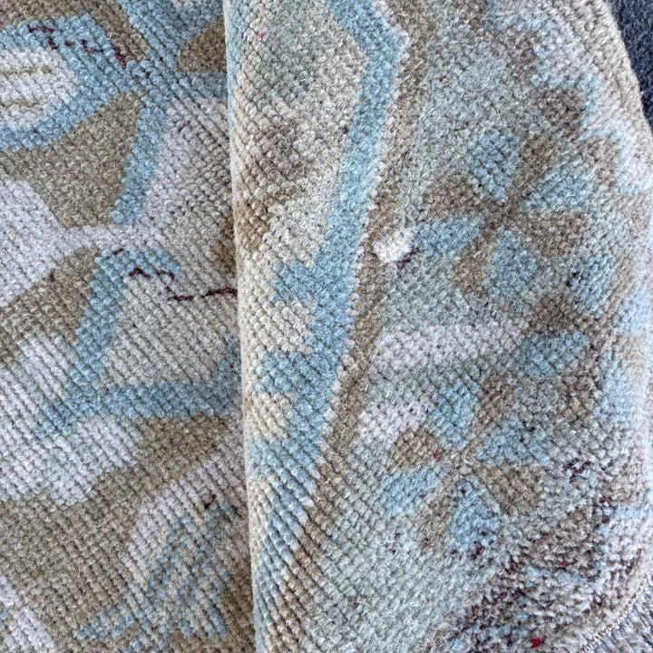 This beautifully weathered Turkish rug showcases the coveted "distressed" look with soft, faded blue and taupe tones that create an effortlessly elegant vintage aesthetic. The intricate floral medallion and botanical border patterns reflect traditional Turkish craftsmanship, while the naturally aged patina adds authentic character and charm.