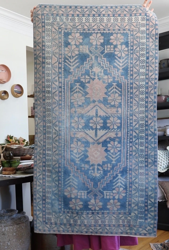 Handwoven using traditional flat-weave kilim techniques, this substantial piece displays the rich textile heritage of Anatolia. The soft, faded blue palette creates a serene, sophisticated aesthetic that works beautifully in both contemporary and traditional interiors. The naturally weathered patina adds authentic vintage character while maintaining the rug's structural integrity.