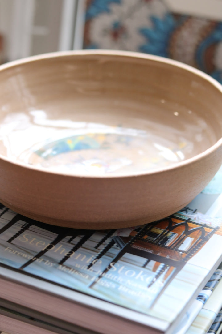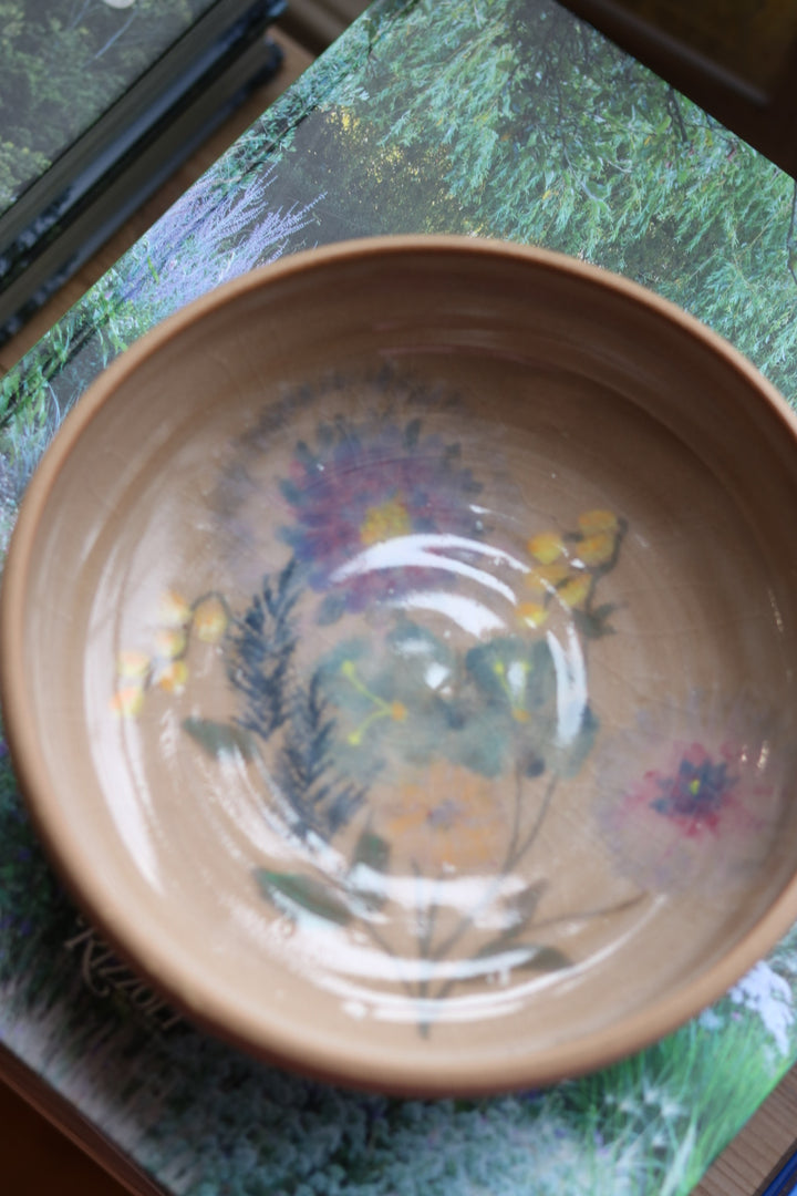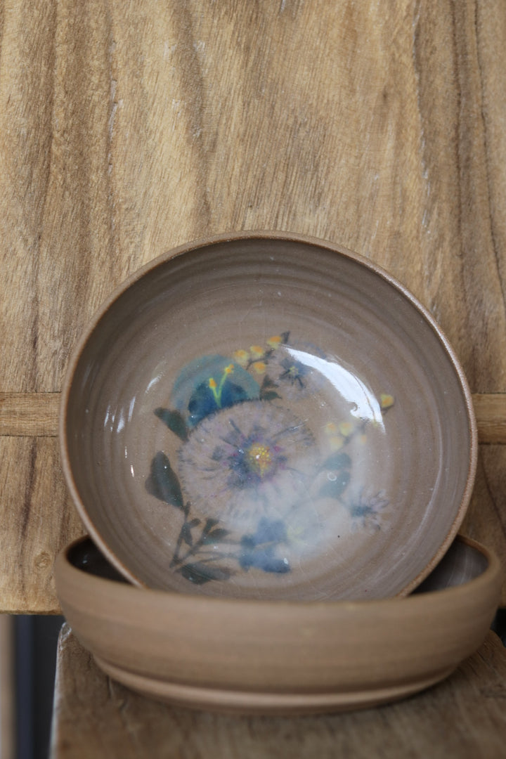 Hand-painted ceramic bowls by Austin ceramicist Ali Bond, featuring delicate watercolor florals in soft blues, purples, and yellows. The warm taupe glaze and organic botanical motifs give each piece a cherished vintage charm. Each bowl is uniquely painted, bringing handcrafted artistry to your table. Sold individually.